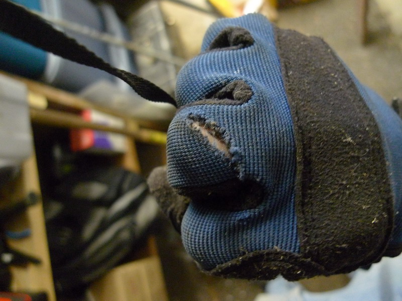 Compelling piece of evidence showing why you should wear safety gloves! This was from my angle grinder with a cut-off blade, that would have made a pretty serious cut without the textile and leather of the glove. In this case, it did not even break the skin.