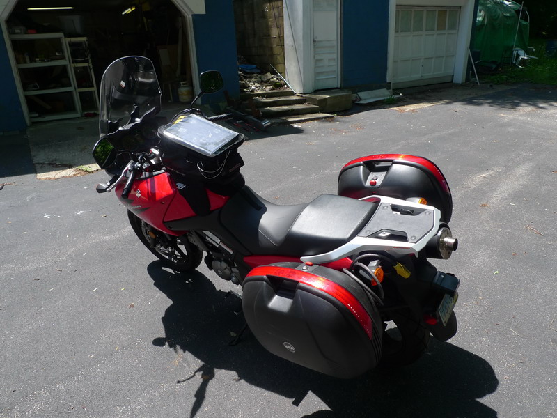 I spent a good deal of time modifying my V-Strom preparing for a trip to Chicago form Connecticut, about 1,000 miles. Here is the V-Strom with a laptop/GPS tank mounted touch screen and the two Givi side cases, and a tall Givi Windscreen