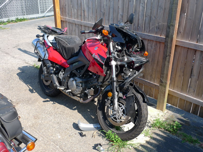 Not more than an hour later, and less than 100 miles - this happened! I T-Boned a car doing about 30mph at an intersection, I hit the car so hard it rotated about 90 degrees. My V-Strom stopped dead, it did not flip over the car, which luckily was a low sedan and not an SUV. I was thrown over the car getting a perplexing set of injuries, I was pretty badly bruised but nothing was broken. I had quite alot of safety gear on, and hit my head hard enough to lose consciousness. I don't even recall the actual accident. My safety gear helped alot, and my modifications did as well. Within two weeks I had collected my insurance check and got another V-Strom, though this time it was the 1,000 CC version =) It took about 9 weeks to be mostly back to normal.