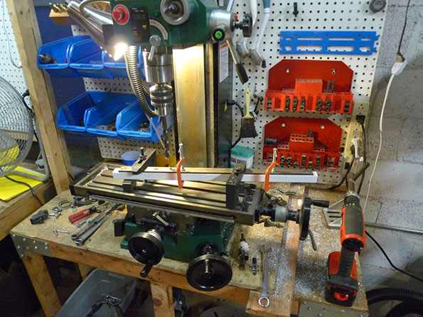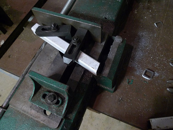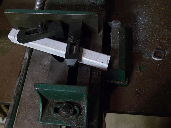 Bolting the existing bars to the new square tubes and mounting on the milling machine to ensure straight square drilling.