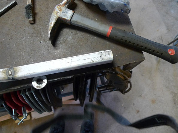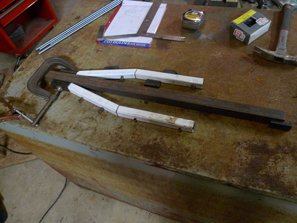 Both sides are cut here and lined up for spot welding against a central bar. A much beefier jig should be used here but instead of making one I was quite meticulous with my spot welds.