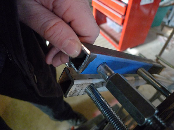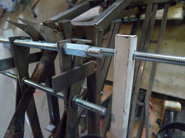 Close up. Helped for mockup with an orange C-Clamp and the threaded rods have not yet been trimmed in length. The bars will not stay like this, I'll be enlarging the holes and welding small tubes across and inside them, and the threaded rods will be replaced with solid rods and bolts.