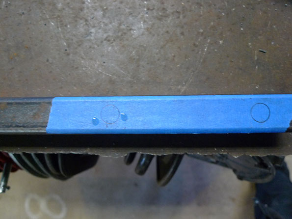 The two holes marked. The dabs of liquid are glue, I used a fender washer from my bearings to line up the holes so they are in the center of the tubes.
