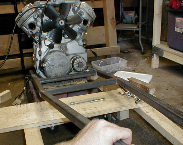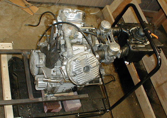 The engine here is being held up against the mounting brackets, notice them just behind the horizontal bar. The mounting point is visible on the engine just to the lower left of the clutch case which has the 'HONDA' label on it. It is a small protrusion that juts out. For my prototype, I'll be starting with a Honda CX500 engine. These are great, transverse V-Twin engines that take up minimal longitudinal space. At 500 CC's, they put out about 45 HP. They also make a CX500 Turbo, and a CX650 Turbo that fills the same platform, so once testing is completed with the smallest engine, I can progressively increase the engine size for further testing by just swapping out the engine.