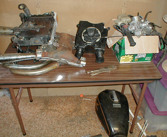 The remaining parts to be added. Roughly from left to right, the radiator, mufflers, airbox, down-pipes, and box o' stuff. The gas tank is below the table.