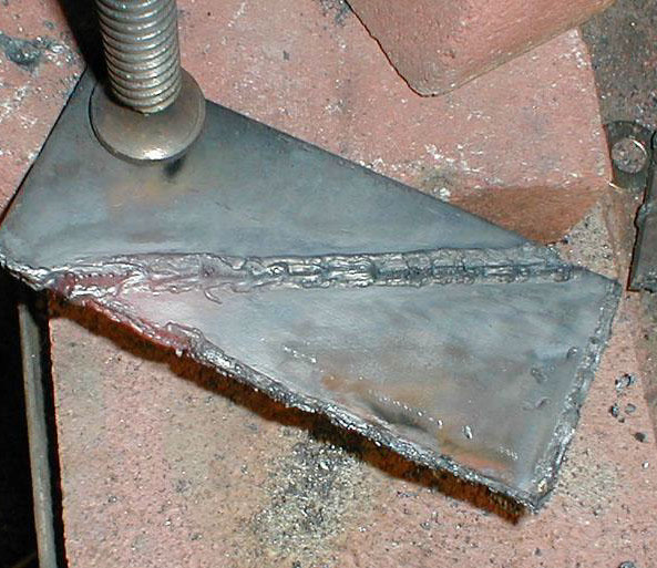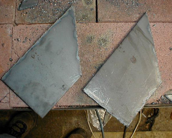 The second group of pieces, these will make up the gussets holding the steering column housing brackets on one end. Still glowing red hot on the left.