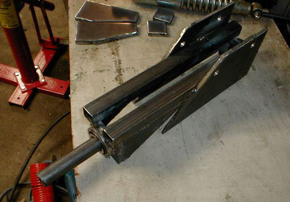 Here the steering column housing and steering column are mounted temporarily to the virtual pivot point bars. Next up is the front fork. Typically, a steering column housing is about 4 or 5 inches long, and completely enclosed. Mine is 18" long, and open on either end. Primarily because of design constraints it is much longer then typically, and it is left open because this is a prototype.