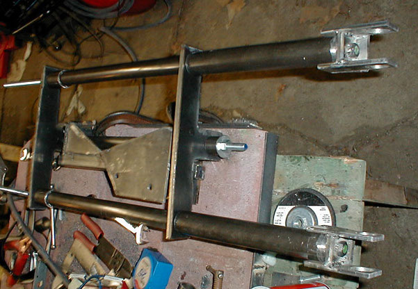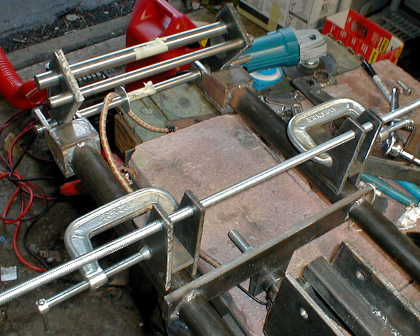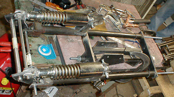 Here the suspension mounts are jigged, aligned, and ready for welding.