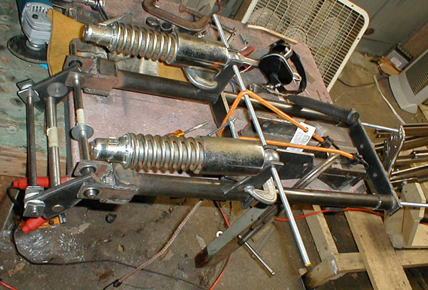 The front suspension, here the bottom links were cut off and then the surface grounded, preparing them for the new links to be welded on. These suspension units are from the rear of my Honda 500.