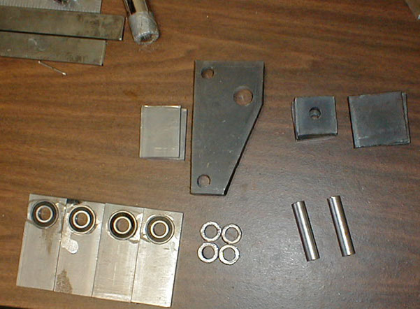 Here are some of the major components ready. The four pieces on the left the ones being drilled above now with bearings inside. In the bottom middle are the spacers, to the bottom right are the 'axles' for where the fork connects to the leading links. In the middle are the actual links.