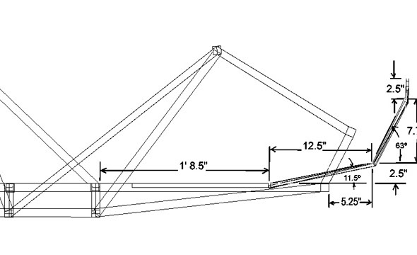 Top view with more dimensions of the foot rest design. The foot rests under went some redesign since the original designs and even since the images above. I decided to make the foot rests constructed of two parallel bars closely spaced that could easily slide in and out (forward and back) to accommodate taller or shorter operators.