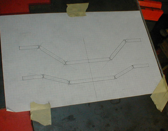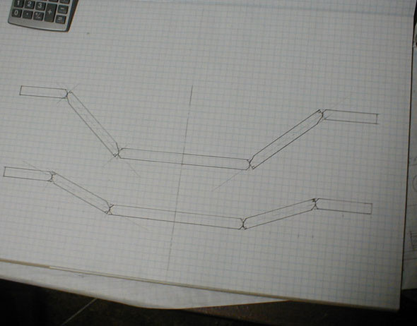 Outlining the fork segments on scale graph paper, ready to have the individual components laid out. The notches are present to allow the beveling required to get good welds.