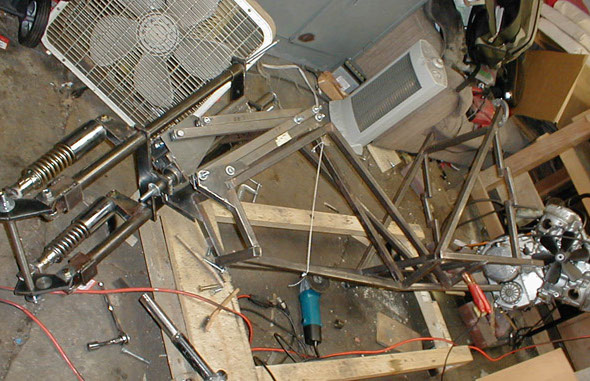 The frame turned on its side to facilitate removal of the bottom beams. They will be replaced by two straight beams. Note the assembled virtual pivot point section holding the steering column in place, with the fork mounted and turned 45degrees.