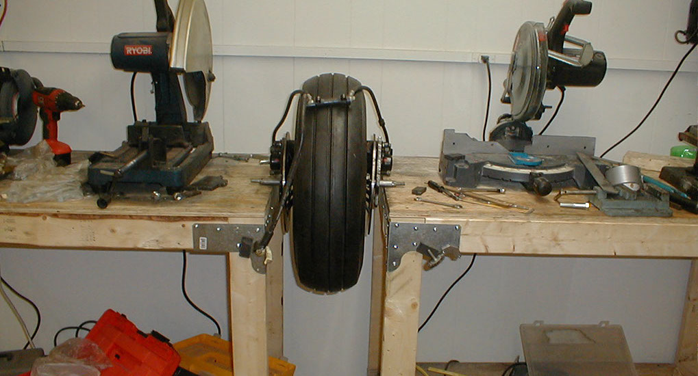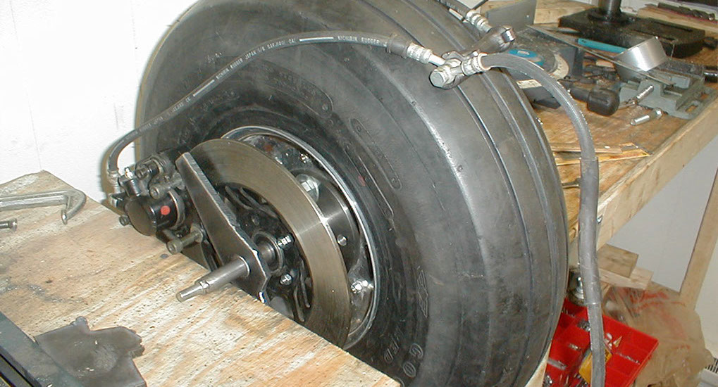 The new front wheel & hub & caliper mounts with brake calipers mounted.