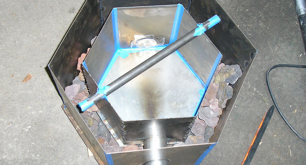 Building the inner cabinet. I wanted a lightweight yet thermally insulative kiln. I recalled how the Romans used pumice in the concrete of the ceiling of the Pantheon, and thought that was a great idea. Filled the base of the kiln with lava rocks.