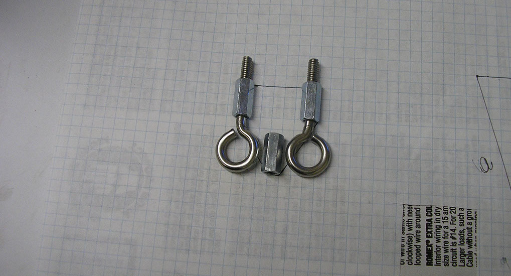 The eyed hooks go to the left and right center stand respectively, while the threaded nut in the middle will attach to the control cable.