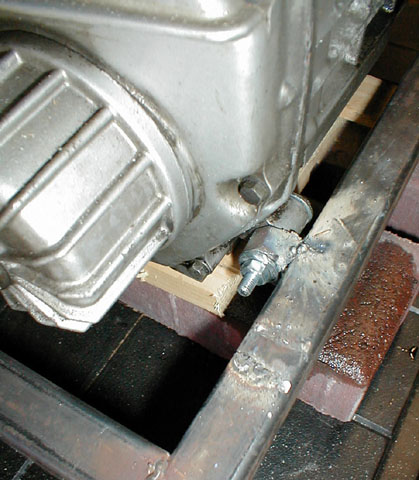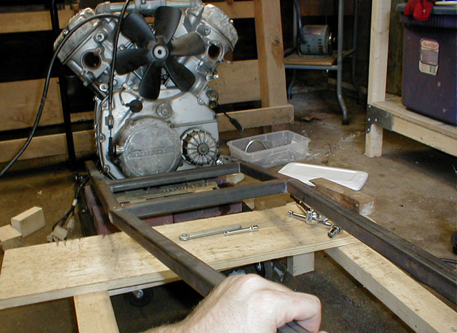 Moving the engine into place and bolting it to the spot welded bracket.