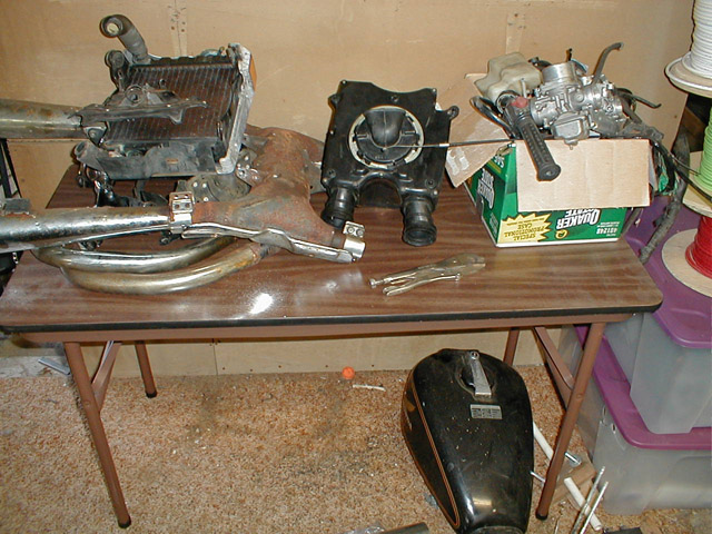 The remaining parts to be added. Roughly from left to right, the radiator, mufflers, airbox, down-pipes, and box o' stuff. The gas tank is below the table.