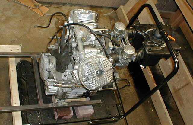 The engine here is being held up against the mounting brackets, notice them just behind the horizontal bar. The mounting point is visible on the engine just to the lower left of the clutch case which has the 'HONDA' label on it. It is a small protrusion that juts out. For my prototype, I'll be starting with a Honda CX500 engine. These are great, transverse V-Twin engines that take up minimal longitudinal space. At 500 CC's, they put out about 45 HP. They also make a CX500 Turbo, and a CX650 Turbo that fills the same platform, so once testing is completed with the smallest engine, I can progressively increase the engine size for further testing by just swapping out the engine.