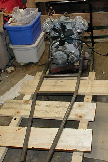 Here was our last starting point. Here the Frame Bottom is mounted to the Engine. After redesigning to take into account the smaller rear wheel size, the frame bottom had to be extended 4 inches and the engine mounting brackets moved back 4 inches.