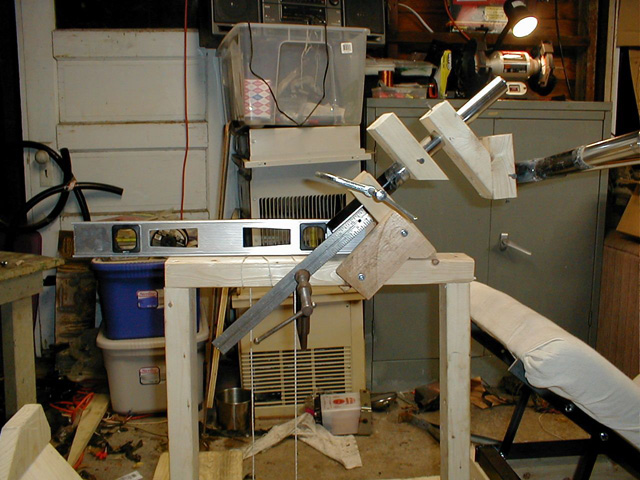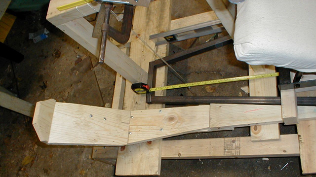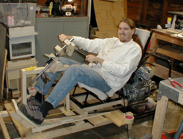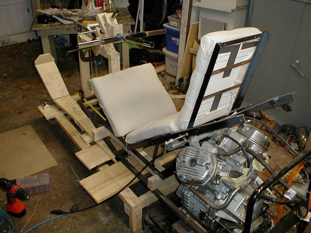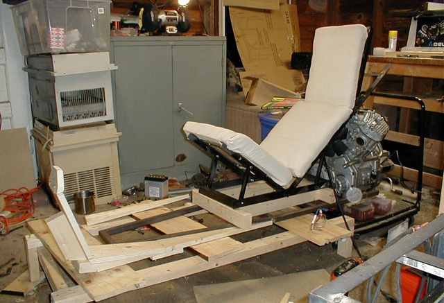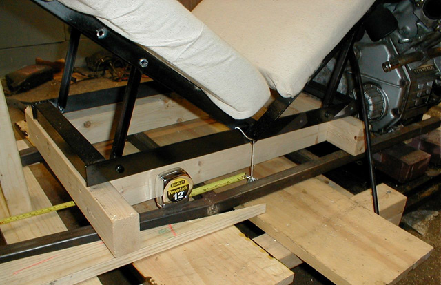 I certainly didn't want to have the whole bike finished, and then sit in it only to find it quite uncomfortable. That being said, I still haven't done any 'extended sitting' tests. I was glad I went through this effort, as the angles and dimension I guessed at were quite off from a comfortable head supporting seat, and some major changes had to be made in the design to accommodate the new data. With that information in mind, I went ahead and decided to build a complete 'ergonomic' mockup of the bike, that is, where I would sit, foot rests, and steering column and handlebars. Here you can see one of the foot rests made of wood to test its location and size.