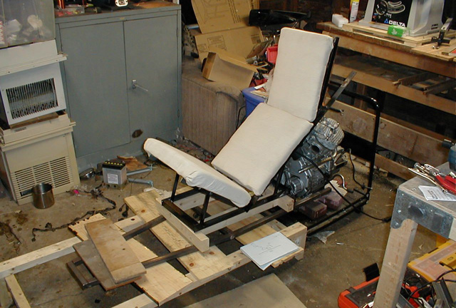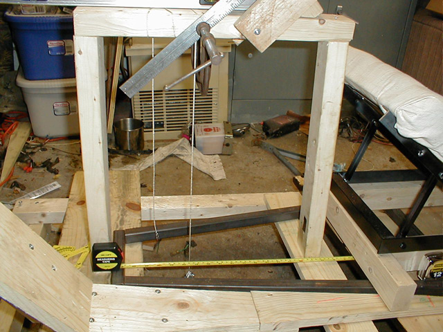 Here the steering column mockup is shown, the front of the seat, and the foot rests. The steering column axis is supposed to cross a point that is 21.5" from the front horizontal cross bar on the frame bottom and 19" up from it.