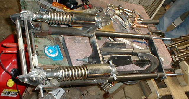 The front suspension, here the bottom links were cut off and then the surface grounded, preparing them for the new links to be welded on. These suspension units are from the rear of my Honda 500.