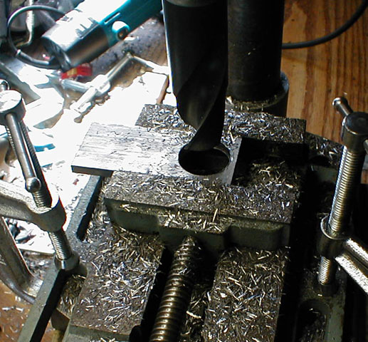 Starting to make the ends of the forks. This is a 1-1/8" OD bit drilling into cold rolled 1-1/2" x 1/4" bar.